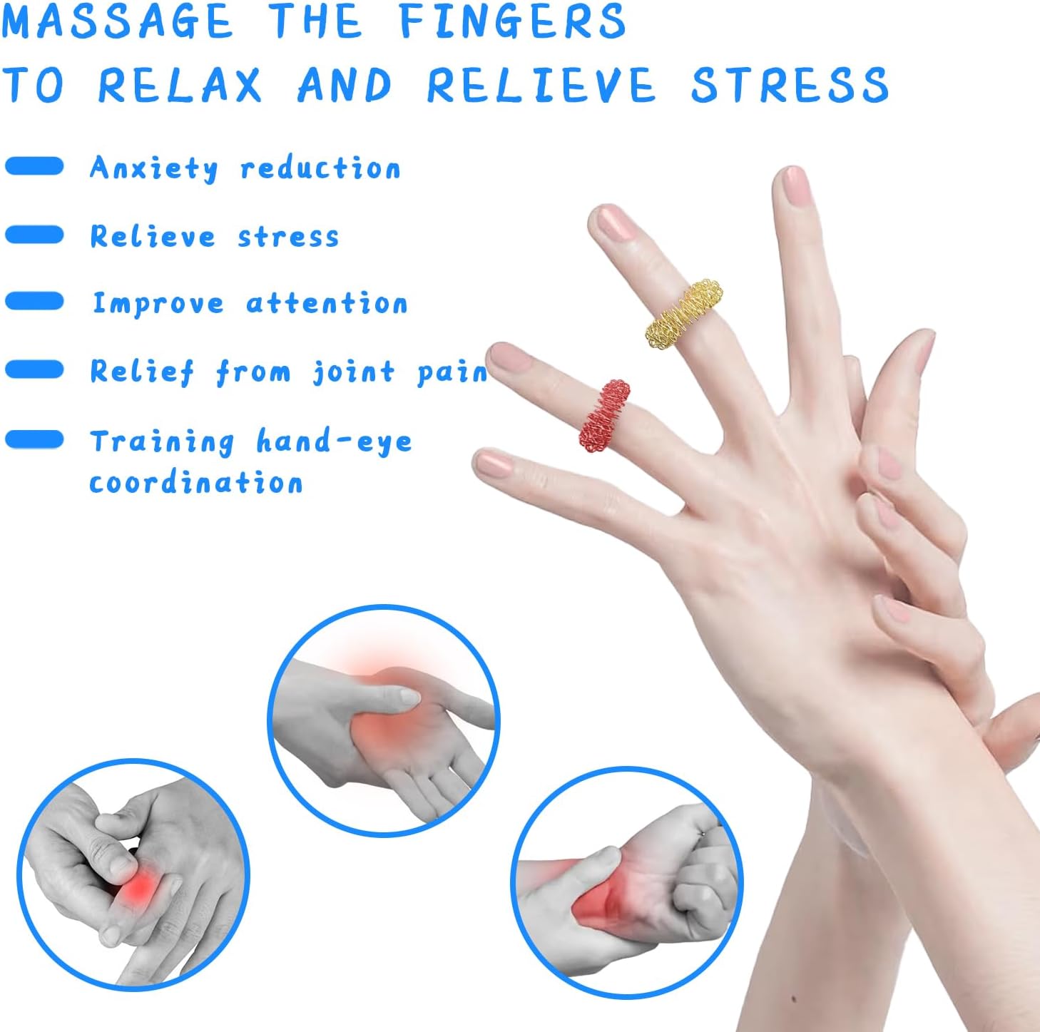 - Multifunctional Acupressure Rings – These acupuncture ring can not only help us reduce anxiety, relieve stress and improve attention, but also act as a finger massager to relieve pain, numbness fatigue and improve blood circulation caused by overuse.