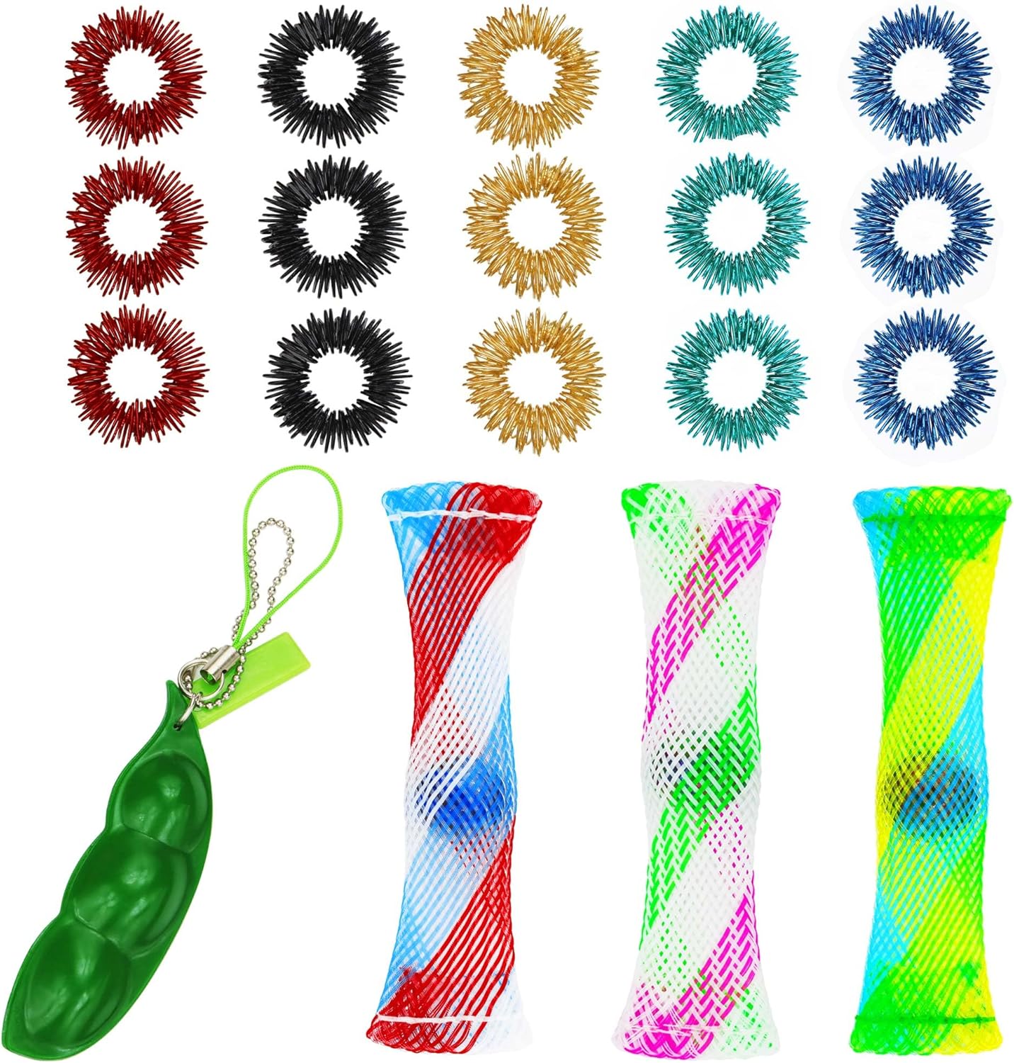 - Value Packing:include 20 pcs Spiky Sensory Rings,1 pcs Squeeze-a-Bean Keyrin,3 pcs Mesh & Marble Toy